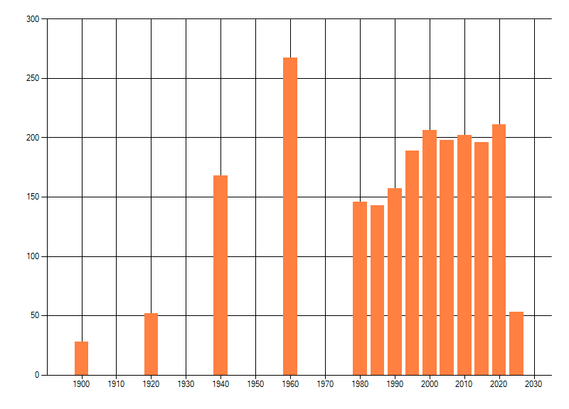 Het aantal atlasblokken (5x5 km) waarin de soort is gemeld binnen een periode van vijf jaar (vanaf 1980) of twintig jaar. Niet gecorrigeerd voor waarnemersinspanning en het aantal doorgegeven waarnemingen kan sterk variƫren per periode, dus een trend in verspreiding kan hier niet direct uit worden afgelezen. Het opgegeven jaartal is het eerste jaar van de periode. Bron: gevalideerde waarnemingen uit de NDFF.