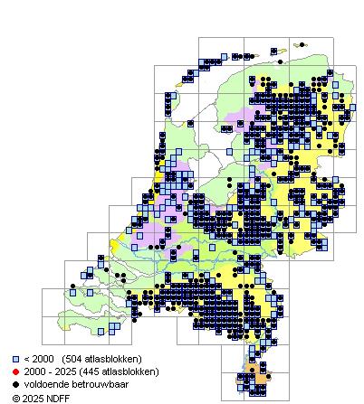 Het voor waarnemingsinspanning gecorrigeerde, of door een expert geschatte aantal atlasblokken (5x5 km) waarin de soort voorkomt per periode van tien jaar. Soms fluctueert het aantal sterk. Hoe vloeiender de lijn, des te betrouwbaarder de grafiek. Bron: Rode Lijst Mossen 2010. © BLWG 2011