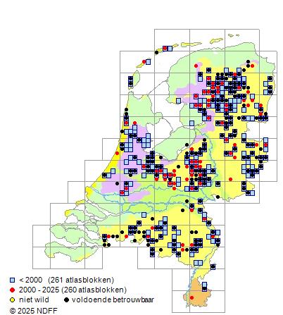 Het voor waarnemingsinspanning gecorrigeerde, of door een expert geschatte aantal atlasblokken (5x5 km) waarin de soort voorkomt per periode van tien jaar. Soms fluctueert het aantal sterk. Hoe vloeiender de lijn, des te betrouwbaarder de grafiek. Bron: Rode Lijst Mossen 2010. © BLWG 2011