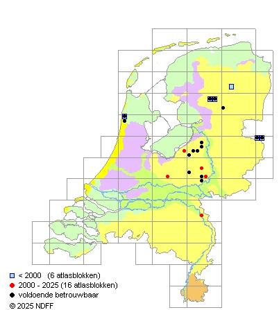 Het voor waarnemingsinspanning gecorrigeerde, of door een expert geschatte aantal atlasblokken (5x5 km) waarin de soort voorkomt per periode van tien jaar. Soms fluctueert het aantal sterk. Hoe vloeiender de lijn, des te betrouwbaarder de grafiek. Bron: Rode Lijst Mossen 2010. © BLWG 2011
