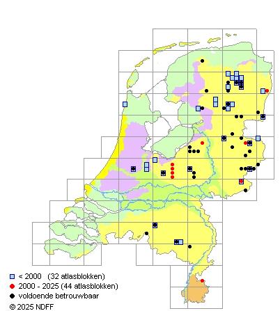 Het voor waarnemingsinspanning gecorrigeerde, of door een expert geschatte aantal atlasblokken (5x5 km) waarin de soort voorkomt per periode van tien jaar. Soms fluctueert het aantal sterk. Hoe vloeiender de lijn, des te betrouwbaarder de grafiek. Bron: Rode Lijst Mossen 2010. © BLWG 2011
