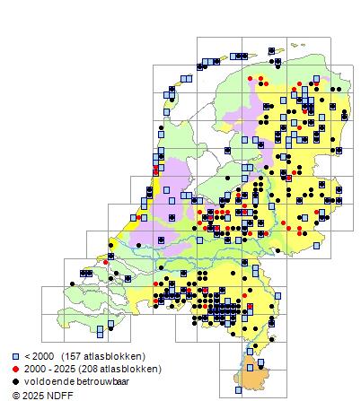 Het voor waarnemingsinspanning gecorrigeerde, of door een expert geschatte aantal atlasblokken (5x5 km) waarin de soort voorkomt per periode van tien jaar. Soms fluctueert het aantal sterk. Hoe vloeiender de lijn, des te betrouwbaarder de grafiek. Bron: Rode Lijst Mossen 2010. © BLWG 2011