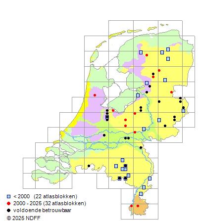 Het aantal atlasblokken (5x5 km) waarin de soort is gemeld binnen een periode van vijf jaar (vanaf 1980) of twintig jaar. Niet gecorrigeerd voor waarnemersinspanning en het aantal doorgegeven waarnemingen kan sterk variëren per periode, dus een trend in verspreiding kan hier niet direct uit worden afgelezen. Het opgegeven jaartal is het eerste jaar van de periode. Bron: gevalideerde waarnemingen uit de NDFF.