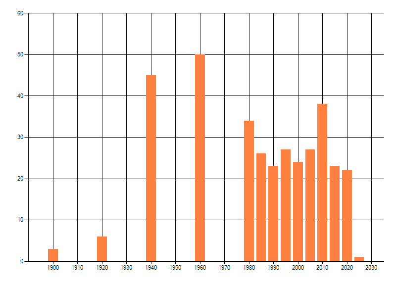 Het aantal atlasblokken (5x5 km) waarin de soort is gemeld binnen een periode van vijf jaar (vanaf 1980) of twintig jaar. Niet gecorrigeerd voor waarnemersinspanning en het aantal doorgegeven waarnemingen kan sterk variëren per periode, dus een trend in verspreiding kan hier niet direct uit worden afgelezen. Het opgegeven jaartal is het eerste jaar van de periode. Bron: gevalideerde waarnemingen uit de NDFF.