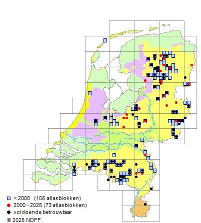 Het voor waarnemingsinspanning gecorrigeerde, of door een expert geschatte aantal atlasblokken (5x5 km) waarin de soort voorkomt per periode van tien jaar. Soms fluctueert het aantal sterk. Hoe vloeiender de lijn, des te betrouwbaarder de grafiek. Bron: Rode Lijst Mossen 2010. © BLWG 2011