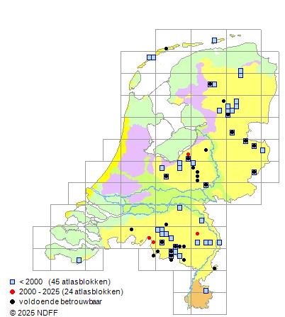 Het voor waarnemingsinspanning gecorrigeerde, of door een expert geschatte aantal atlasblokken (5x5 km) waarin de soort voorkomt per periode van tien jaar. Soms fluctueert het aantal sterk. Hoe vloeiender de lijn, des te betrouwbaarder de grafiek. Bron: Rode Lijst Mossen 2010. © BLWG 2011