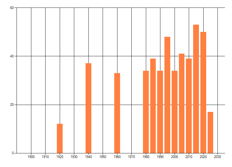Het aantal atlasblokken (5x5 km) waarin de soort is gemeld binnen een periode van vijf jaar (vanaf 1980) of twintig jaar. Niet gecorrigeerd voor waarnemersinspanning en het aantal doorgegeven waarnemingen kan sterk variëren per periode, dus een trend in verspreiding kan hier niet direct uit worden afgelezen. Het opgegeven jaartal is het eerste jaar van de periode. Bron: gevalideerde waarnemingen uit de NDFF.