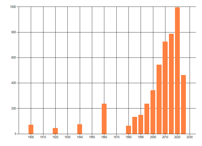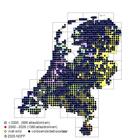 Het aantal atlasblokken (5x5 km) waarin de soort is gemeld binnen een periode van vijf jaar (vanaf 1980) of twintig jaar. Niet gecorrigeerd voor waarnemersinspanning en het aantal doorgegeven waarnemingen kan sterk variƫren per periode, dus een trend in verspreiding kan hier niet direct uit worden afgelezen. Het opgegeven jaartal is het eerste jaar van de periode. Bron: gevalideerde waarnemingen uit de NDFF.
