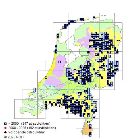 Het voor waarnemingsinspanning gecorrigeerde, of door een expert geschatte aantal atlasblokken (5x5 km) waarin de soort voorkomt per periode van tien jaar. Soms fluctueert het aantal sterk. Hoe vloeiender de lijn, des te betrouwbaarder de grafiek. Bron: Rode Lijst Mossen 2010. © BLWG 2011