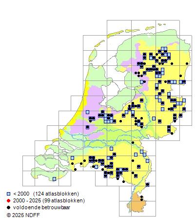 Het aantal atlasblokken (5x5 km) waarin de soort is gemeld binnen een periode van vijf jaar (vanaf 1980) of twintig jaar. Niet gecorrigeerd voor waarnemersinspanning en het aantal doorgegeven waarnemingen kan sterk variëren per periode, dus een trend in verspreiding kan hier niet direct uit worden afgelezen. Het opgegeven jaartal is het eerste jaar van de periode. Bron: gevalideerde waarnemingen uit de NDFF.