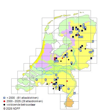 Het voor waarnemingsinspanning gecorrigeerde, of door een expert geschatte aantal atlasblokken (5x5 km) waarin de soort voorkomt per periode van tien jaar. Soms fluctueert het aantal sterk. Hoe vloeiender de lijn, des te betrouwbaarder de grafiek. Bron: Rode Lijst Mossen 2010. © BLWG 2011