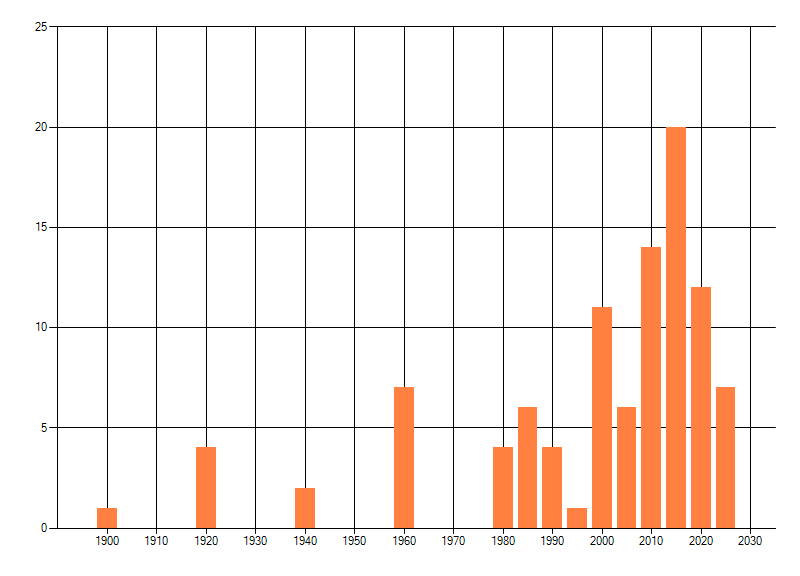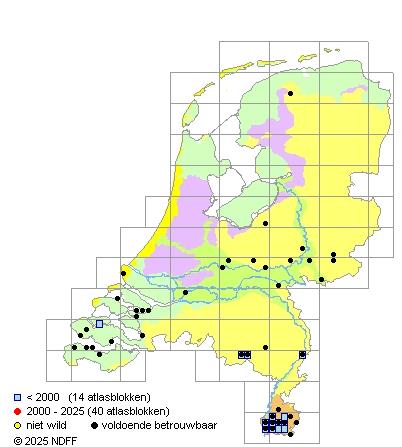 Het aantal atlasblokken (5x5 km) waarin de soort is gemeld binnen een periode van vijf jaar (vanaf 1980) of twintig jaar. Niet gecorrigeerd voor waarnemersinspanning en het aantal doorgegeven waarnemingen kan sterk variëren per periode, dus een trend in verspreiding kan hier niet direct uit worden afgelezen. Het opgegeven jaartal is het eerste jaar van de periode. Bron: gevalideerde waarnemingen uit de NDFF.
