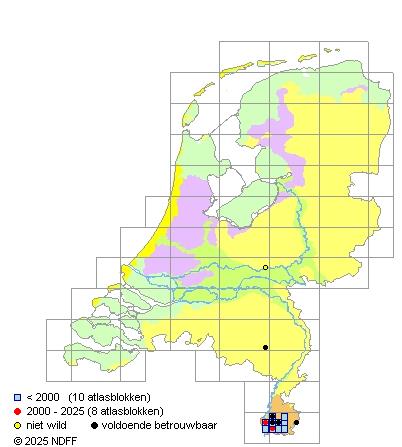 Het voor waarnemingsinspanning gecorrigeerde, of door een expert geschatte aantal atlasblokken (5x5 km) waarin de soort voorkomt per periode van tien jaar. Soms fluctueert het aantal sterk. Hoe vloeiender de lijn, des te betrouwbaarder de grafiek. Bron: Rode Lijst Mossen 2010. © BLWG 2011