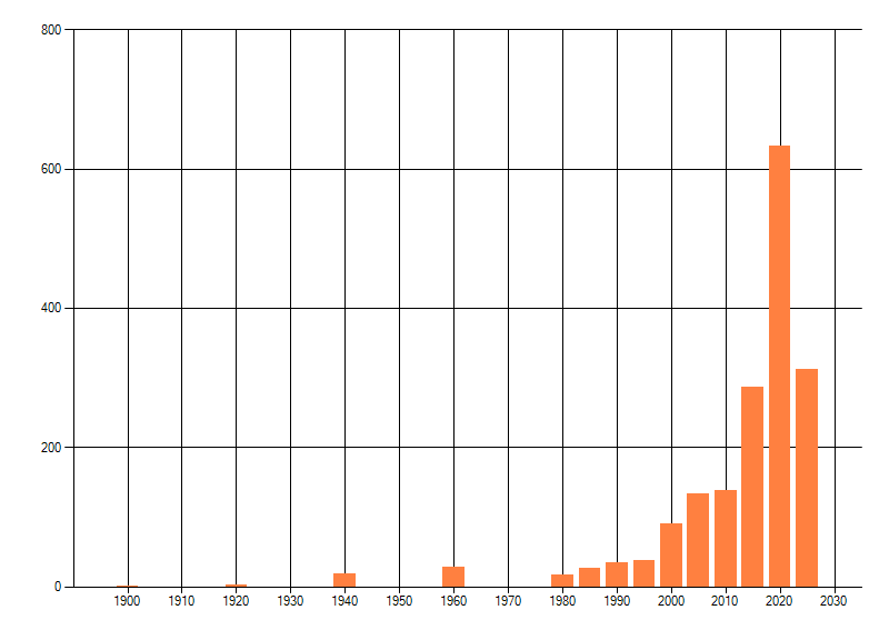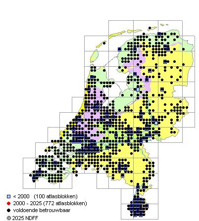Het aantal atlasblokken (5x5 km) waarin de soort is gemeld binnen een periode van vijf jaar (vanaf 1980) of twintig jaar. Niet gecorrigeerd voor waarnemersinspanning en het aantal doorgegeven waarnemingen kan sterk variƫren per periode, dus een trend in verspreiding kan hier niet direct uit worden afgelezen. Het opgegeven jaartal is het eerste jaar van de periode. Bron: gevalideerde waarnemingen uit de NDFF.