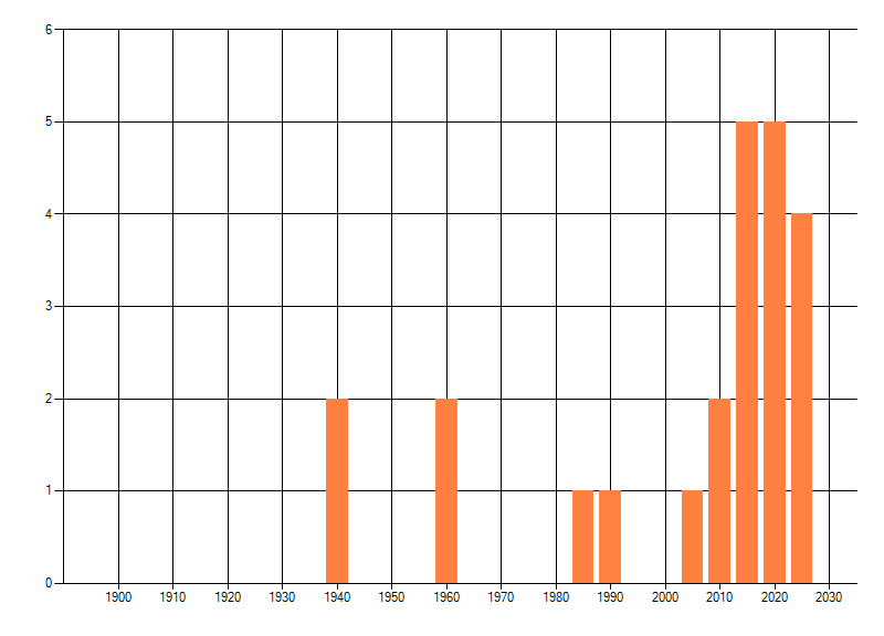 Het aantal atlasblokken (5x5 km) waarin de soort is gemeld binnen een periode van vijf jaar (vanaf 1980) of twintig jaar. Niet gecorrigeerd voor waarnemersinspanning en het aantal doorgegeven waarnemingen kan sterk variëren per periode, dus een trend in verspreiding kan hier niet direct uit worden afgelezen. Het opgegeven jaartal is het eerste jaar van de periode. Bron: gevalideerde waarnemingen uit de NDFF.