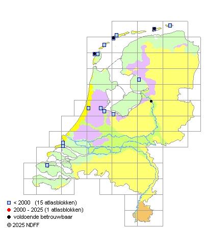Het aantal atlasblokken (5x5 km) waarin de soort is gemeld binnen een periode van vijf jaar (vanaf 1980) of twintig jaar. Niet gecorrigeerd voor waarnemersinspanning en het aantal doorgegeven waarnemingen kan sterk variëren per periode, dus een trend in verspreiding kan hier niet direct uit worden afgelezen. Het opgegeven jaartal is het eerste jaar van de periode. Bron: gevalideerde waarnemingen uit de NDFF.