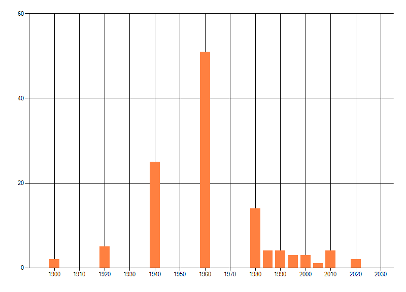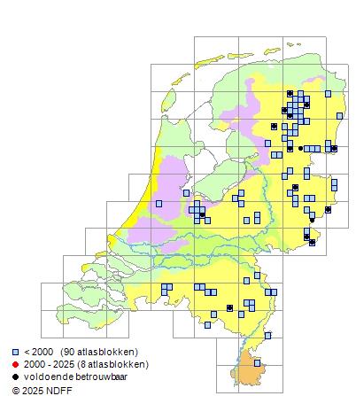 Het aantal atlasblokken (5x5 km) waarin de soort is gemeld binnen een periode van vijf jaar (vanaf 1980) of twintig jaar. Niet gecorrigeerd voor waarnemersinspanning en het aantal doorgegeven waarnemingen kan sterk variëren per periode, dus een trend in verspreiding kan hier niet direct uit worden afgelezen. Het opgegeven jaartal is het eerste jaar van de periode. Bron: gevalideerde waarnemingen uit de NDFF.