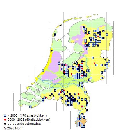 Het voor waarnemingsinspanning gecorrigeerde, of door een expert geschatte aantal atlasblokken (5x5 km) waarin de soort voorkomt per periode van tien jaar. Soms fluctueert het aantal sterk. Hoe vloeiender de lijn, des te betrouwbaarder de grafiek. Bron: Rode Lijst Mossen 2010. © BLWG 2011