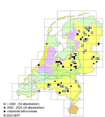 Het voor waarnemingsinspanning gecorrigeerde, of door een expert geschatte aantal atlasblokken (5x5 km) waarin de soort voorkomt per periode van tien jaar. Soms fluctueert het aantal sterk. Hoe vloeiender de lijn, des te betrouwbaarder de grafiek. Bron: Rode Lijst Mossen 2010. © BLWG 2011