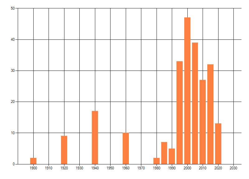Het aantal atlasblokken (5x5 km) waarin de soort is gemeld binnen een periode van vijf jaar (vanaf 1980) of twintig jaar. Niet gecorrigeerd voor waarnemersinspanning en het aantal doorgegeven waarnemingen kan sterk variƫren per periode, dus een trend in verspreiding kan hier niet direct uit worden afgelezen. Het opgegeven jaartal is het eerste jaar van de periode. Bron: gevalideerde waarnemingen uit de NDFF.