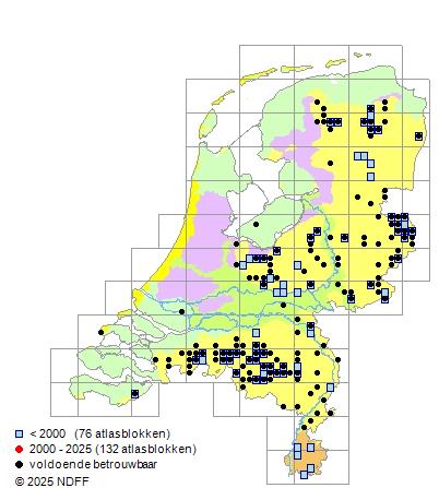Het voor waarnemingsinspanning gecorrigeerde, of door een expert geschatte aantal atlasblokken (5x5 km) waarin de soort voorkomt per periode van tien jaar. Soms fluctueert het aantal sterk. Hoe vloeiender de lijn, des te betrouwbaarder de grafiek. Bron: Rode Lijst Mossen 2010. © BLWG 2011
