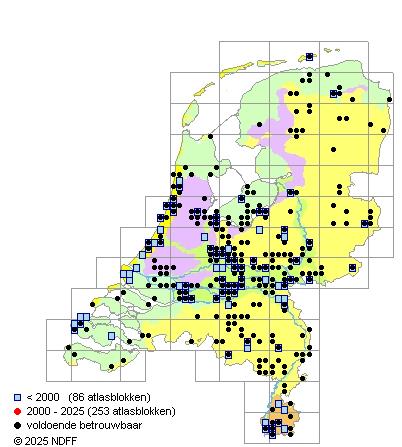 Het aantal atlasblokken (5x5 km) waarin de soort is gemeld binnen een periode van vijf jaar (vanaf 1980) of twintig jaar. Niet gecorrigeerd voor waarnemersinspanning en het aantal doorgegeven waarnemingen kan sterk variëren per periode, dus een trend in verspreiding kan hier niet direct uit worden afgelezen. Het opgegeven jaartal is het eerste jaar van de periode. Bron: gevalideerde waarnemingen uit de NDFF.