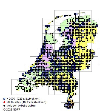 Het voor waarnemingsinspanning gecorrigeerde, of door een expert geschatte aantal atlasblokken (5x5 km) waarin de soort voorkomt per periode van tien jaar. Soms fluctueert het aantal sterk. Hoe vloeiender de lijn, des te betrouwbaarder de grafiek. Bron: Rode Lijst Mossen 2010. © BLWG 2011