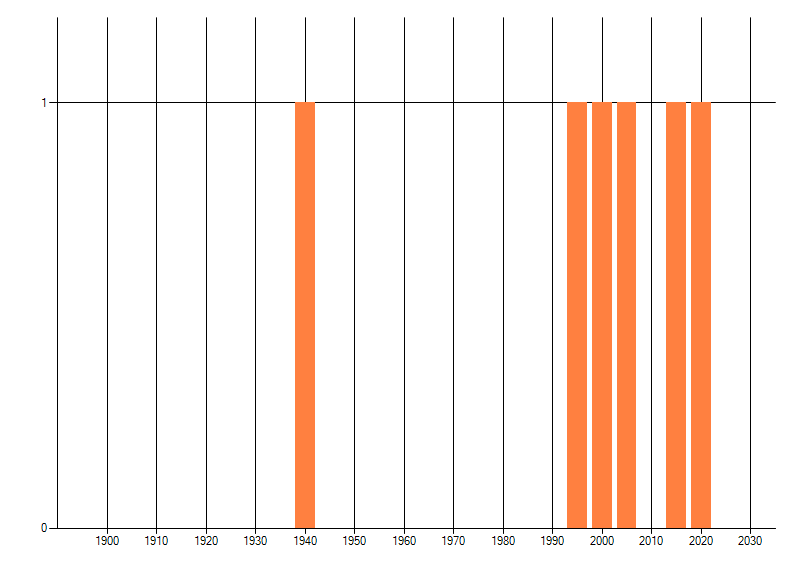 Het aantal atlasblokken (5x5 km) waarin de soort is gemeld binnen een periode van vijf jaar (vanaf 1980) of twintig jaar. Niet gecorrigeerd voor waarnemersinspanning en het aantal doorgegeven waarnemingen kan sterk variëren per periode, dus een trend in verspreiding kan hier niet direct uit worden afgelezen. Het opgegeven jaartal is het eerste jaar van de periode. Bron: gevalideerde waarnemingen uit de NDFF.