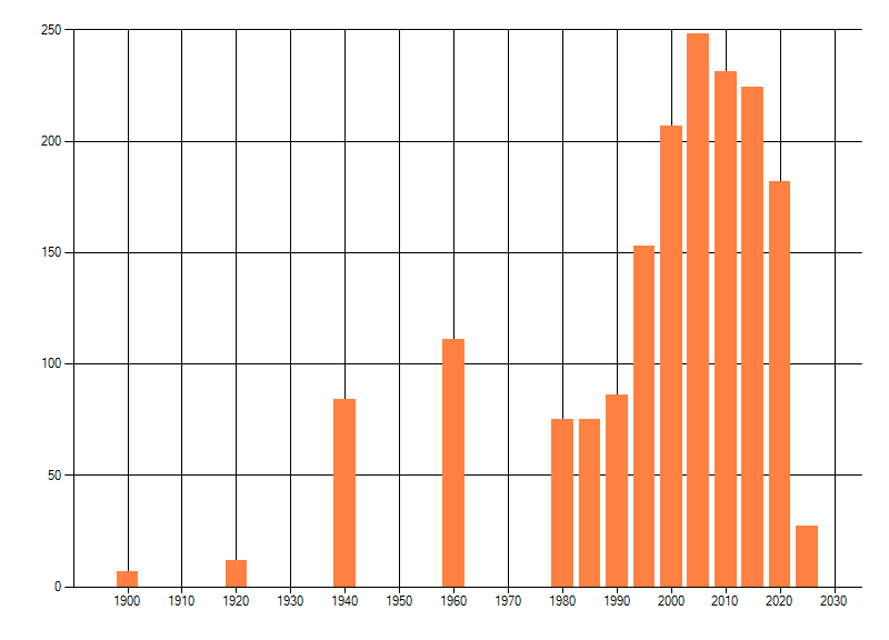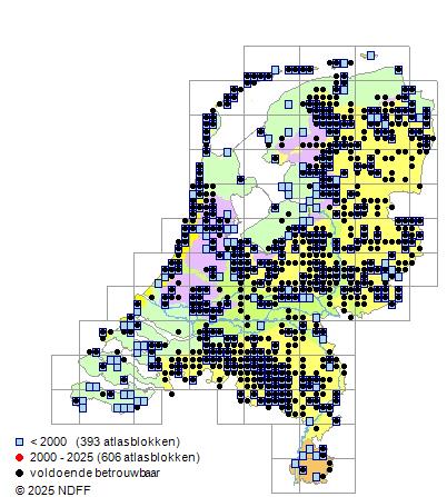 Het aantal atlasblokken (5x5 km) waarin de soort is gemeld binnen een periode van vijf jaar (vanaf 1980) of twintig jaar. Niet gecorrigeerd voor waarnemersinspanning en het aantal doorgegeven waarnemingen kan sterk variƫren per periode, dus een trend in verspreiding kan hier niet direct uit worden afgelezen. Het opgegeven jaartal is het eerste jaar van de periode. Bron: gevalideerde waarnemingen uit de NDFF.