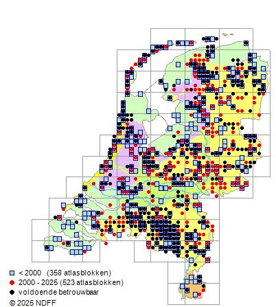 Het voor waarnemingsinspanning gecorrigeerde, of door een expert geschatte aantal atlasblokken (5x5 km) waarin de soort voorkomt per periode van tien jaar. Soms fluctueert het aantal sterk. Hoe vloeiender de lijn, des te betrouwbaarder de grafiek. Bron: Rode Lijst Mossen 2010. © BLWG 2011