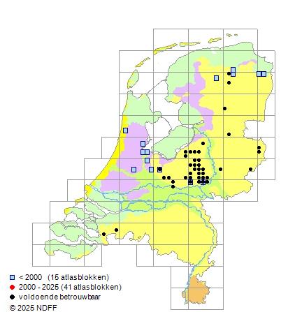 Het voor waarnemingsinspanning gecorrigeerde, of door een expert geschatte aantal atlasblokken (5x5 km) waarin de soort voorkomt per periode van tien jaar. Soms fluctueert het aantal sterk. Hoe vloeiender de lijn, des te betrouwbaarder de grafiek. Bron: Rode Lijst Mossen 2010. © BLWG 2011