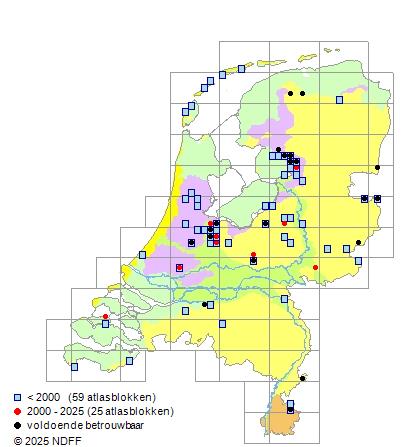Het voor waarnemingsinspanning gecorrigeerde, of door een expert geschatte aantal atlasblokken (5x5 km) waarin de soort voorkomt per periode van tien jaar. Soms fluctueert het aantal sterk. Hoe vloeiender de lijn, des te betrouwbaarder de grafiek. Bron: Rode Lijst Mossen 2010. © BLWG 2011