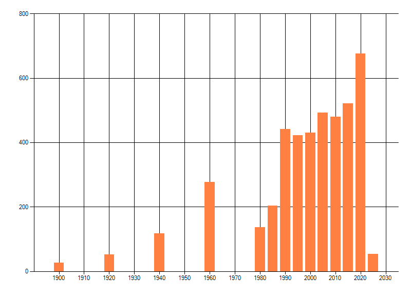 Het aantal atlasblokken (5x5 km) waarin de soort is gemeld binnen een periode van vijf jaar (vanaf 1980) of twintig jaar. Niet gecorrigeerd voor waarnemersinspanning en het aantal doorgegeven waarnemingen kan sterk variëren per periode, dus een trend in verspreiding kan hier niet direct uit worden afgelezen. Het opgegeven jaartal is het eerste jaar van de periode. Bron: gevalideerde waarnemingen uit de NDFF.