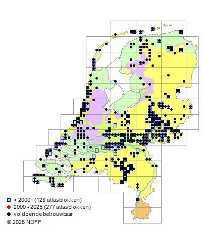 Het voor waarnemingsinspanning gecorrigeerde, of door een expert geschatte aantal atlasblokken (5x5 km) waarin de soort voorkomt per periode van tien jaar. Soms fluctueert het aantal sterk. Hoe vloeiender de lijn, des te betrouwbaarder de grafiek. Bron: Rode Lijst Mossen 2010. © BLWG 2011