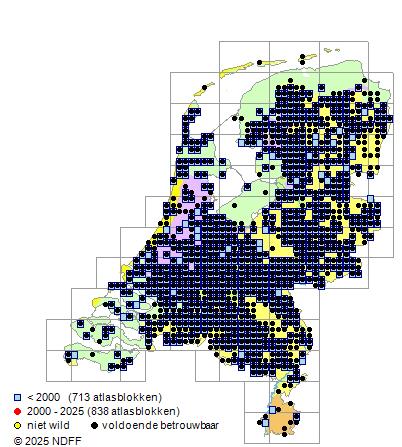 Het voor waarnemingsinspanning gecorrigeerde, of door een expert geschatte aantal atlasblokken (5x5 km) waarin de soort voorkomt per periode van tien jaar. Soms fluctueert het aantal sterk. Hoe vloeiender de lijn, des te betrouwbaarder de grafiek. Bron: Rode Lijst Mossen 2010. © BLWG 2011