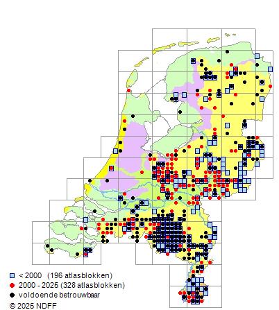 Het voor waarnemingsinspanning gecorrigeerde, of door een expert geschatte aantal atlasblokken (5x5 km) waarin de soort voorkomt per periode van tien jaar. Soms fluctueert het aantal sterk. Hoe vloeiender de lijn, des te betrouwbaarder de grafiek. Bron: Rode Lijst Mossen 2010. © BLWG 2011