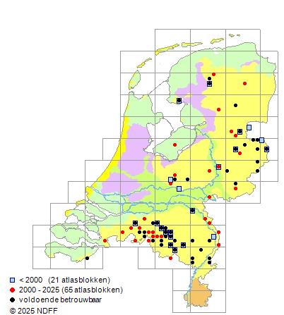 Het voor waarnemingsinspanning gecorrigeerde, of door een expert geschatte aantal atlasblokken (5x5 km) waarin de soort voorkomt per periode van tien jaar. Soms fluctueert het aantal sterk. Hoe vloeiender de lijn, des te betrouwbaarder de grafiek. Bron: Rode Lijst Mossen 2010. © BLWG 2011