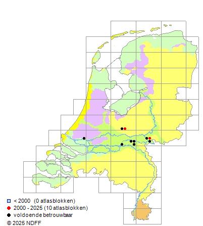 Het aantal atlasblokken (5x5 km) waarin de soort is gemeld binnen een periode van vijf jaar (vanaf 1980) of twintig jaar. Niet gecorrigeerd voor waarnemersinspanning en het aantal doorgegeven waarnemingen kan sterk variëren per periode, dus een trend in verspreiding kan hier niet direct uit worden afgelezen. Het opgegeven jaartal is het eerste jaar van de periode. Bron: gevalideerde waarnemingen uit de NDFF.