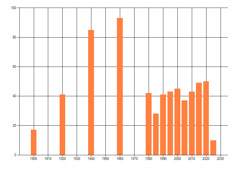 Het aantal atlasblokken (5x5 km) waarin de soort is gemeld binnen een periode van vijf jaar (vanaf 1980) of twintig jaar. Niet gecorrigeerd voor waarnemersinspanning en het aantal doorgegeven waarnemingen kan sterk variƫren per periode, dus een trend in verspreiding kan hier niet direct uit worden afgelezen. Het opgegeven jaartal is het eerste jaar van de periode. Bron: gevalideerde waarnemingen uit de NDFF.