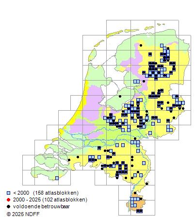 Het voor waarnemingsinspanning gecorrigeerde, of door een expert geschatte aantal atlasblokken (5x5 km) waarin de soort voorkomt per periode van tien jaar. Soms fluctueert het aantal sterk. Hoe vloeiender de lijn, des te betrouwbaarder de grafiek. Bron: Rode Lijst Mossen 2010. © BLWG 2011