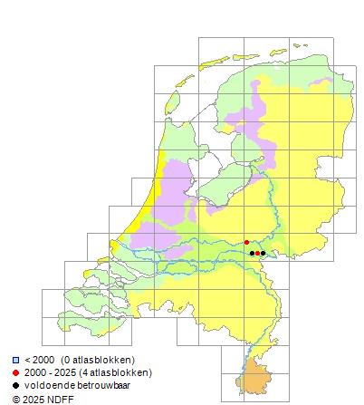 Het aantal atlasblokken (5x5 km) waarin de soort is gemeld binnen een periode van vijf jaar (vanaf 1980) of twintig jaar.