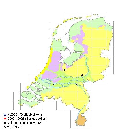 Het aantal atlasblokken (5x5 km) waarin de soort is gemeld binnen een periode van vijf jaar (vanaf 1980) of twintig jaar.