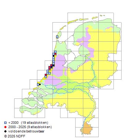 Het aantal atlasblokken (5x5 km) waarin de soort is gemeld binnen een periode van vijf jaar (vanaf 1980) of twintig jaar. Niet gecorrigeerd voor waarnemersinspanning en het aantal doorgegeven waarnemingen kan sterk variëren per periode, dus een trend in verspreiding kan hier niet direct uit worden afgelezen. Het opgegeven jaartal is het eerste jaar van de periode. Bron: gevalideerde waarnemingen uit de NDFF.