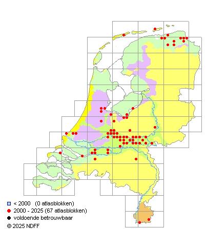 Het aantal atlasblokken (5x5 km) waarin de soort is gemeld binnen een periode van vijf jaar (vanaf 1980) of twintig jaar. Niet gecorrigeerd voor waarnemersinspanning en het aantal doorgegeven waarnemingen kan sterk variëren per periode, dus een trend in verspreiding kan hier niet direct uit worden afgelezen. Het opgegeven jaartal is het eerste jaar van de periode. Bron: gevalideerde waarnemingen uit de NDFF.