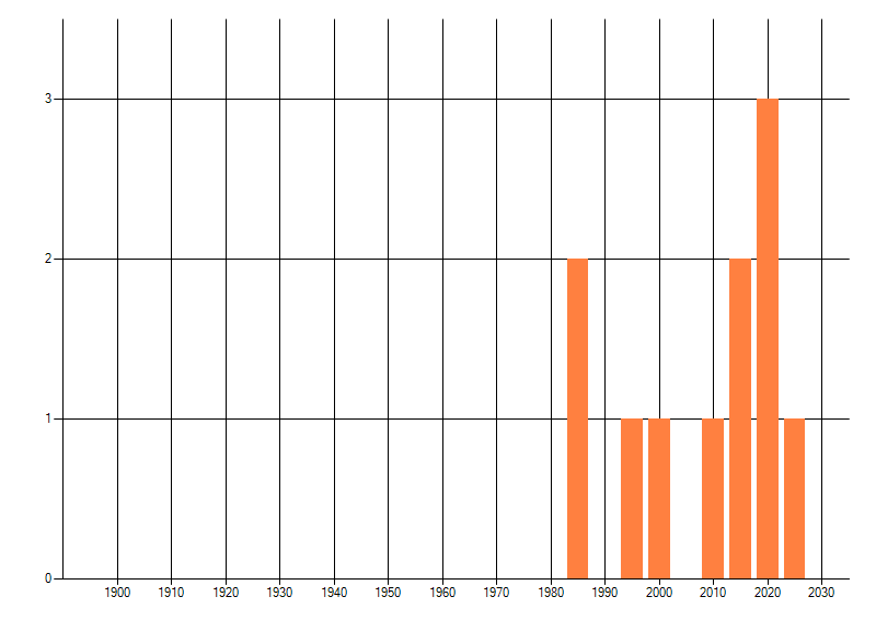 Het aantal atlasblokken (5x5 km) waarin de soort is gemeld binnen een periode van vijf jaar (vanaf 1980) of twintig jaar. Niet gecorrigeerd voor waarnemersinspanning en het aantal doorgegeven waarnemingen kan sterk variëren per periode, dus een trend in verspreiding kan hier niet direct uit worden afgelezen. Het opgegeven jaartal is het eerste jaar van de periode. Bron: gevalideerde waarnemingen uit de NDFF.