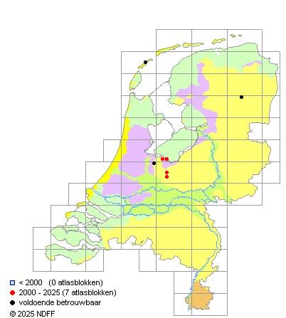 Het aantal atlasblokken (5x5 km) waarin de soort is gemeld binnen een periode van vijf jaar (vanaf 1980) of twintig jaar. Niet gecorrigeerd voor waarnemersinspanning en het aantal doorgegeven waarnemingen kan sterk variëren per periode, dus een trend in verspreiding kan hier niet direct uit worden afgelezen. Het opgegeven jaartal is het eerste jaar van de periode. Bron: gevalideerde waarnemingen uit de NDFF.
