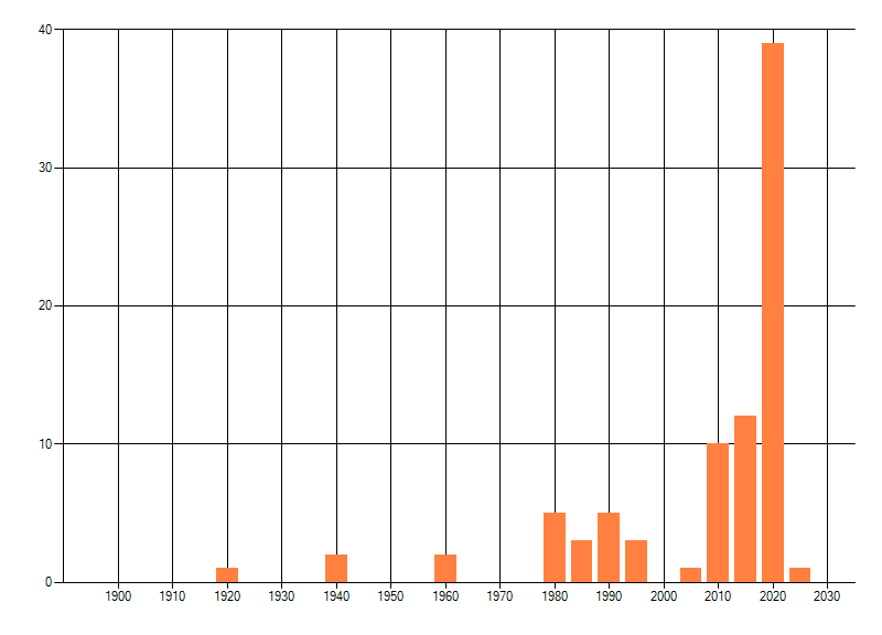 Het aantal atlasblokken (5x5 km) waarin de soort is gemeld binnen een periode van vijf jaar (vanaf 1980) of twintig jaar. Niet gecorrigeerd voor waarnemersinspanning en het aantal doorgegeven waarnemingen kan sterk variëren per periode, dus een trend in verspreiding kan hier niet direct uit worden afgelezen. Het opgegeven jaartal is het eerste jaar van de periode. Bron: gevalideerde waarnemingen uit de NDFF.