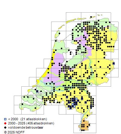 Het aantal atlasblokken (5x5 km) waarin de soort is gemeld binnen een periode van vijf jaar (vanaf 1980) of twintig jaar. Niet gecorrigeerd voor waarnemersinspanning en het aantal doorgegeven waarnemingen kan sterk variëren per periode, dus een trend in verspreiding kan hier niet direct uit worden afgelezen. Het opgegeven jaartal is het eerste jaar van de periode. Bron: gevalideerde waarnemingen uit de NDFF.
