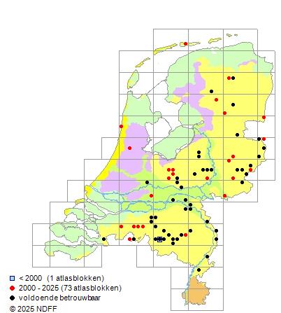 Het aantal atlasblokken (5x5 km) waarin de soort is gemeld binnen een periode van vijf jaar (vanaf 1980) of twintig jaar. Niet gecorrigeerd voor waarnemersinspanning en het aantal doorgegeven waarnemingen kan sterk variëren per periode, dus een trend in verspreiding kan hier niet direct uit worden afgelezen. Het opgegeven jaartal is het eerste jaar van de periode. Bron: gevalideerde waarnemingen uit de NDFF.