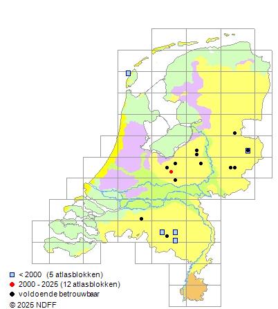 Het aantal atlasblokken (5x5 km) waarin de soort is gemeld binnen een periode van vijf jaar (vanaf 1980) of twintig jaar. Niet gecorrigeerd voor waarnemersinspanning en het aantal doorgegeven waarnemingen kan sterk variëren per periode, dus een trend in verspreiding kan hier niet direct uit worden afgelezen. Het opgegeven jaartal is het eerste jaar van de periode. Bron: gevalideerde waarnemingen uit de NDFF.